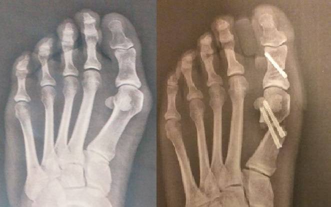 Para realizar dicha corrección utilizamos osteotomías correctivas y las estabilizamos con tornillos de 3 a 3.5 mm canulados, podemos observar las fotos del pie y radiografias antes y despues